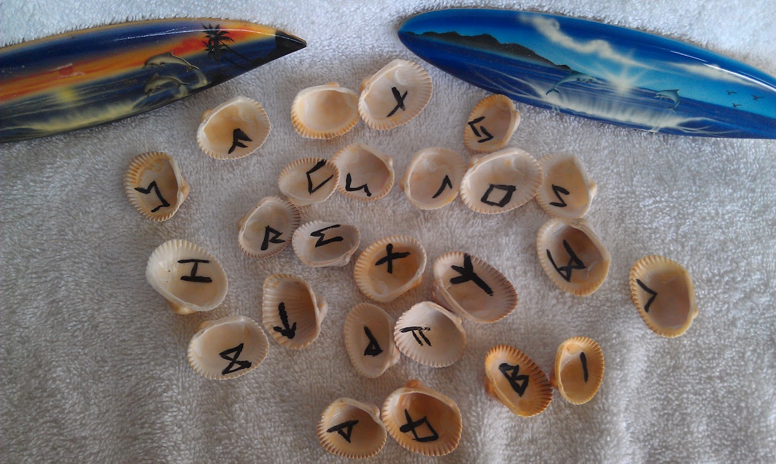 the Elder Futhark rune symbols on each shell. Used like regular runes,